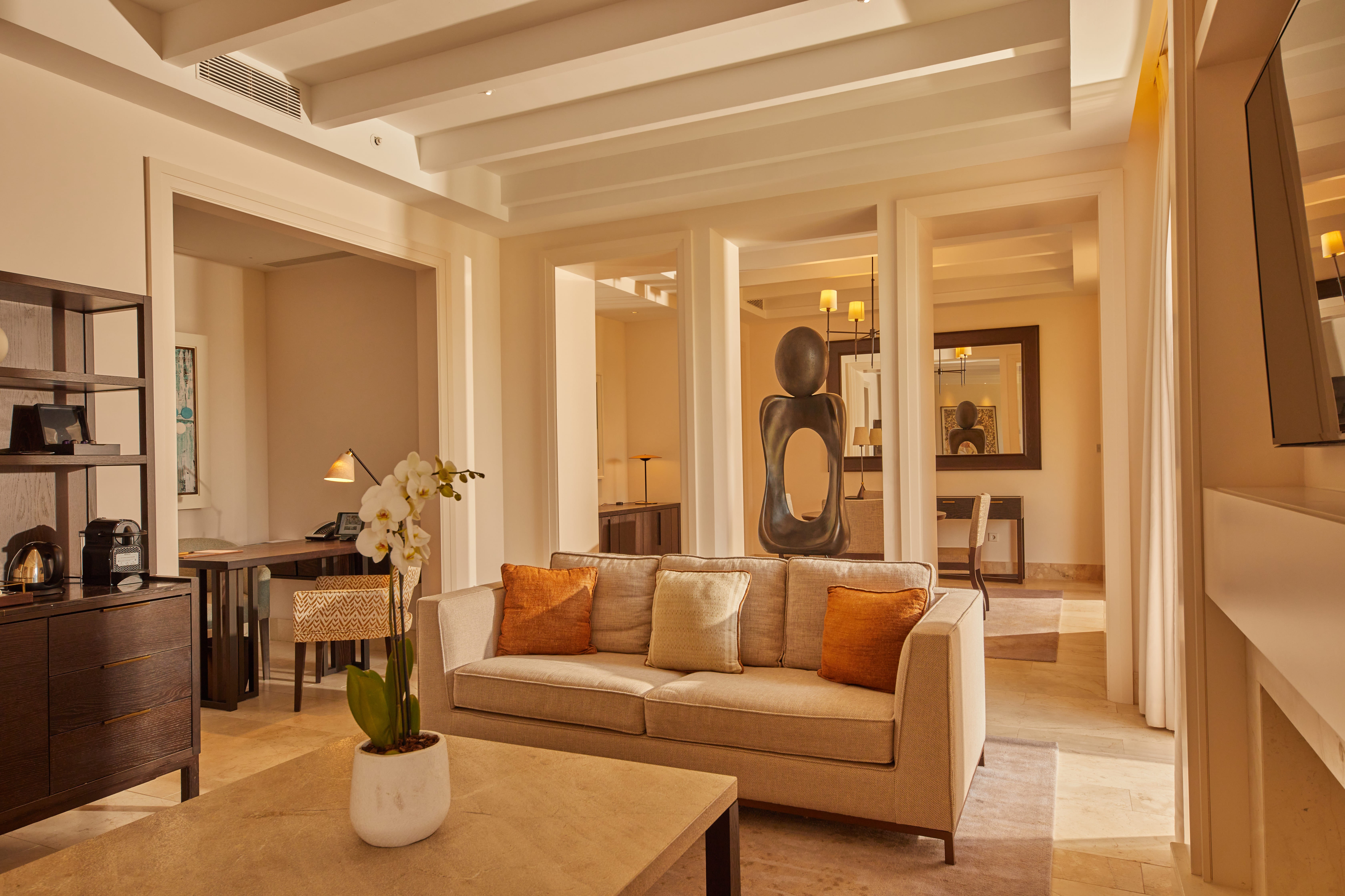 Enjoy this spacious presidential suite of 103 square meters with one or two bedrooms, with a queen bed in the master bedroom, a separate living and dining area, a private terrace with access to the garden and sun loungers, complimentary minibar, coffee and tea maker, bathroom with separate bathtub and shower, dressing room, and desk.